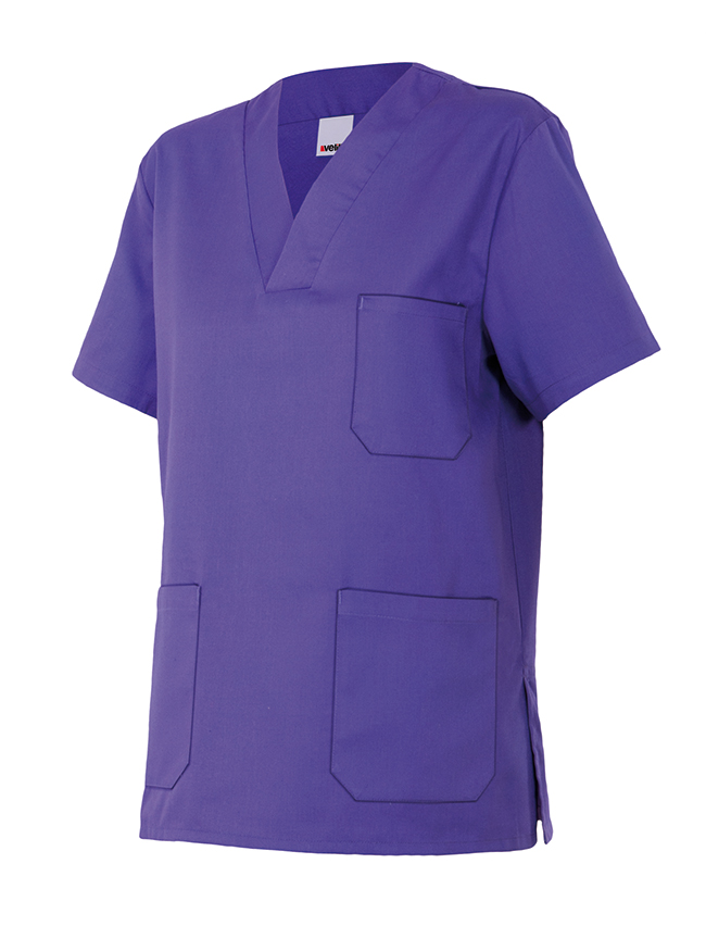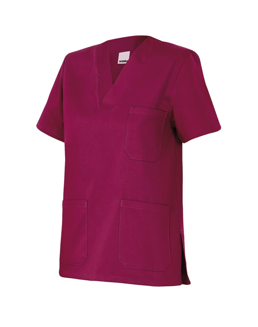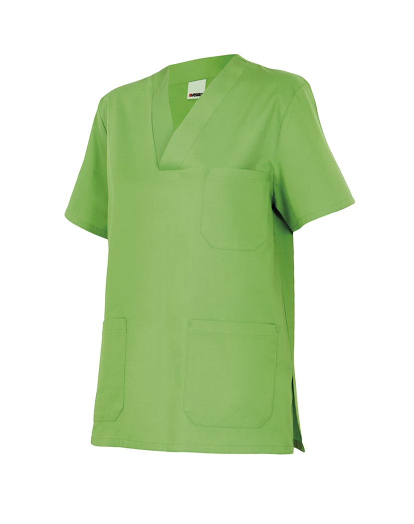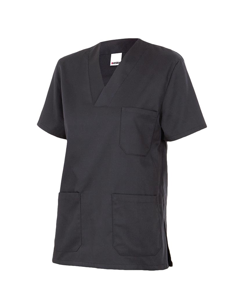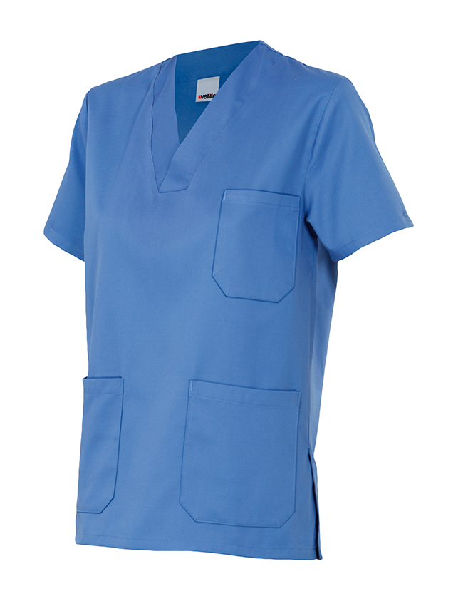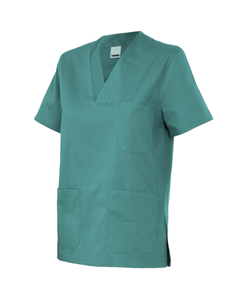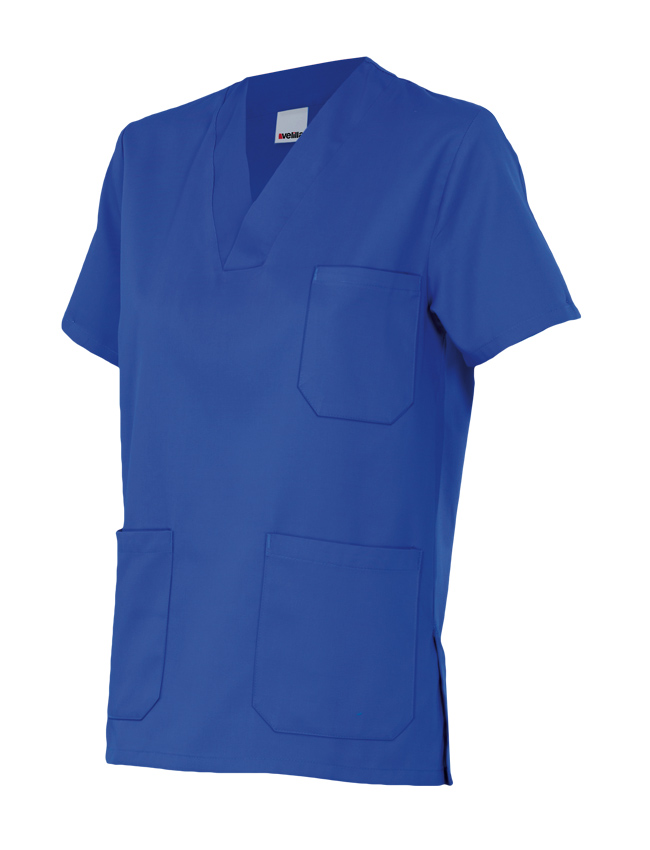 Camisola sanitaria de Sarga poliester-algodón con cuello en pico y aberturas laterales.